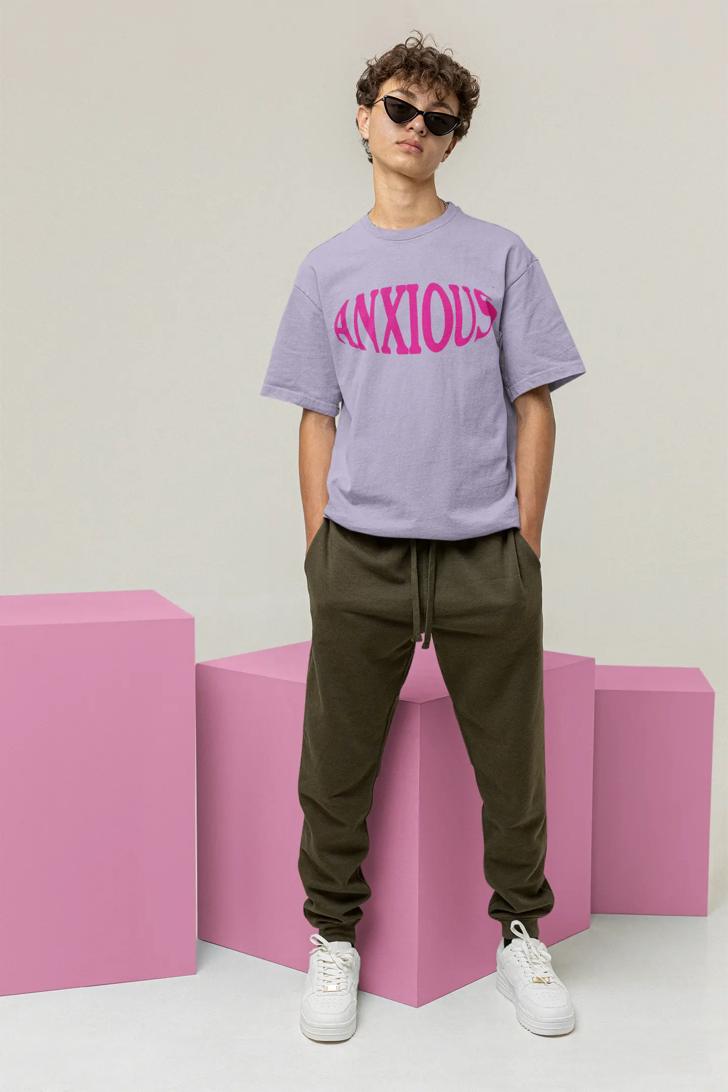 Unisex short sleeve lavender t-shirt with anxious graphic print. Oversized fit in a medium-weight cotton (240 GSM).