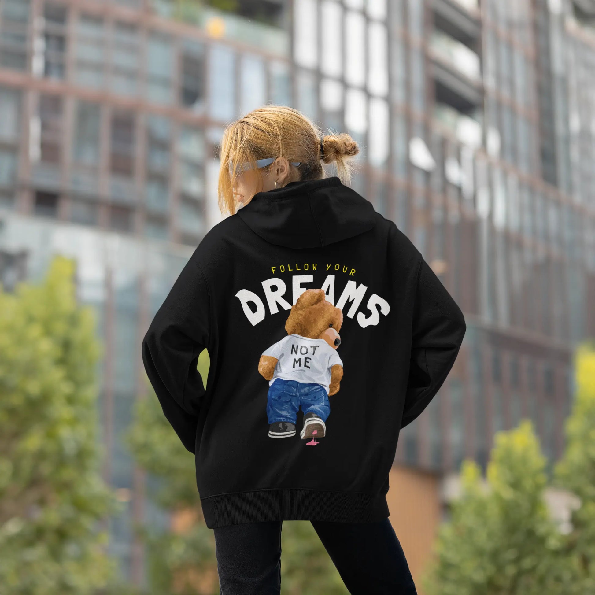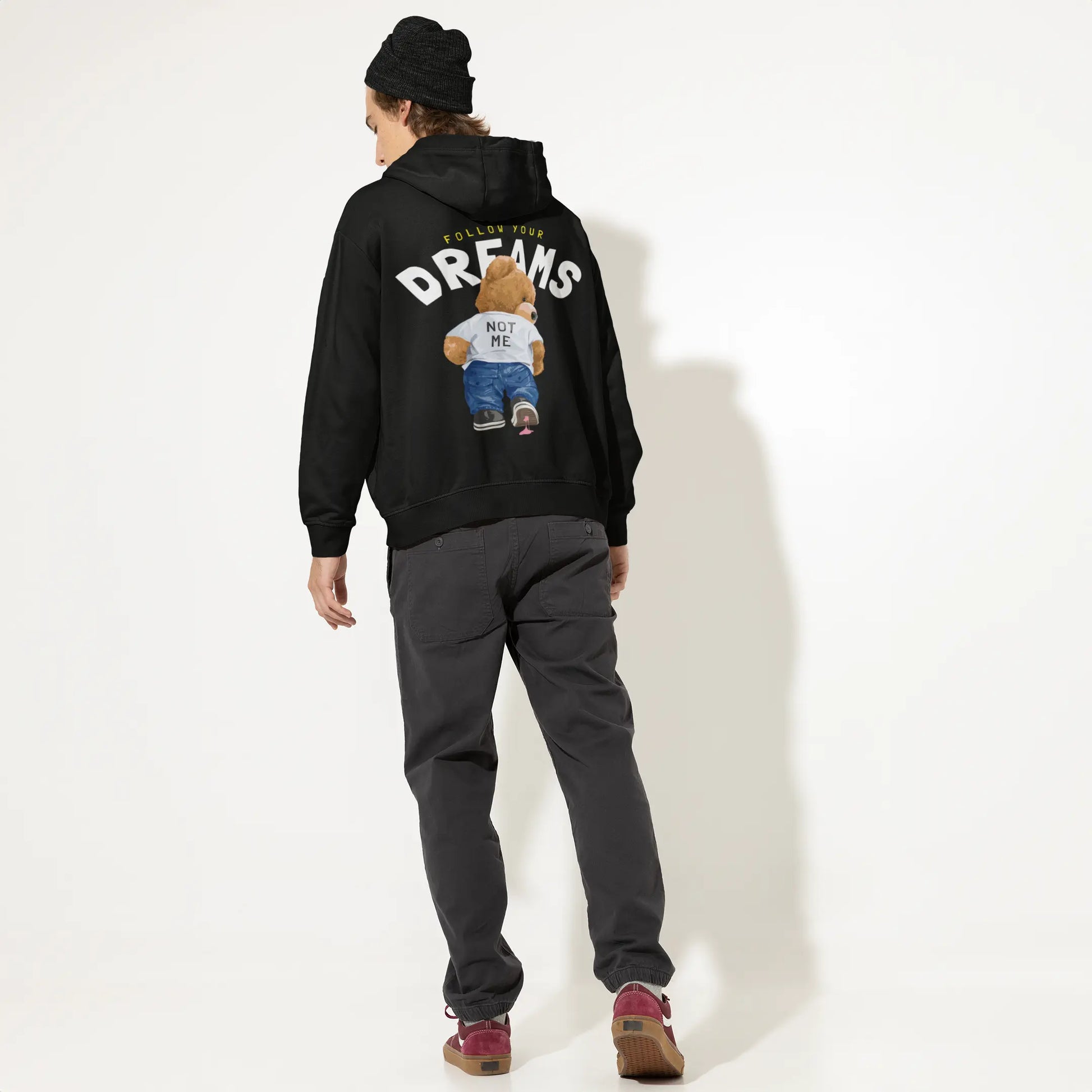A black colored graphic hoodie in full sleeve with Follow Your Dreams Teddy printed at the back and front.