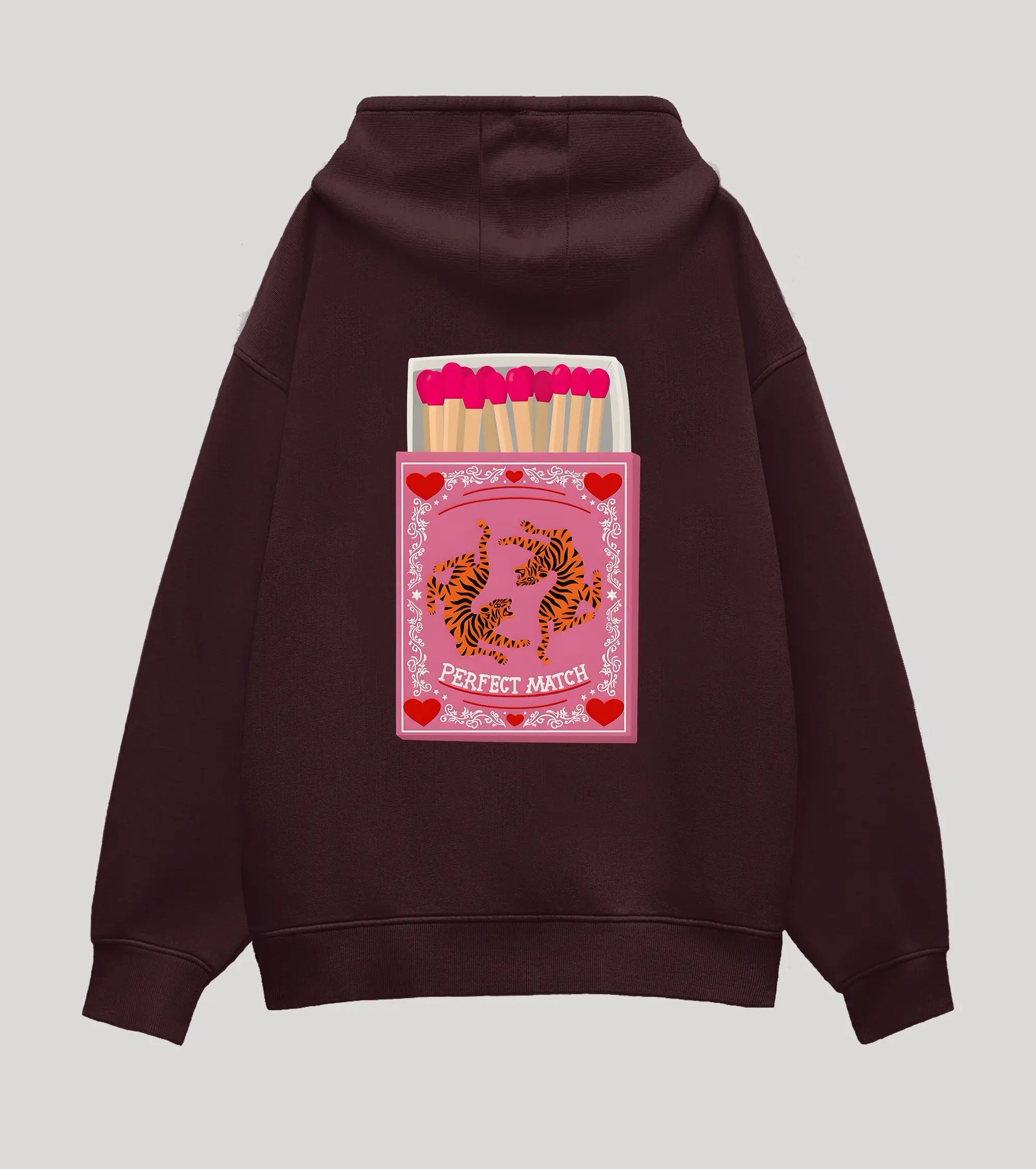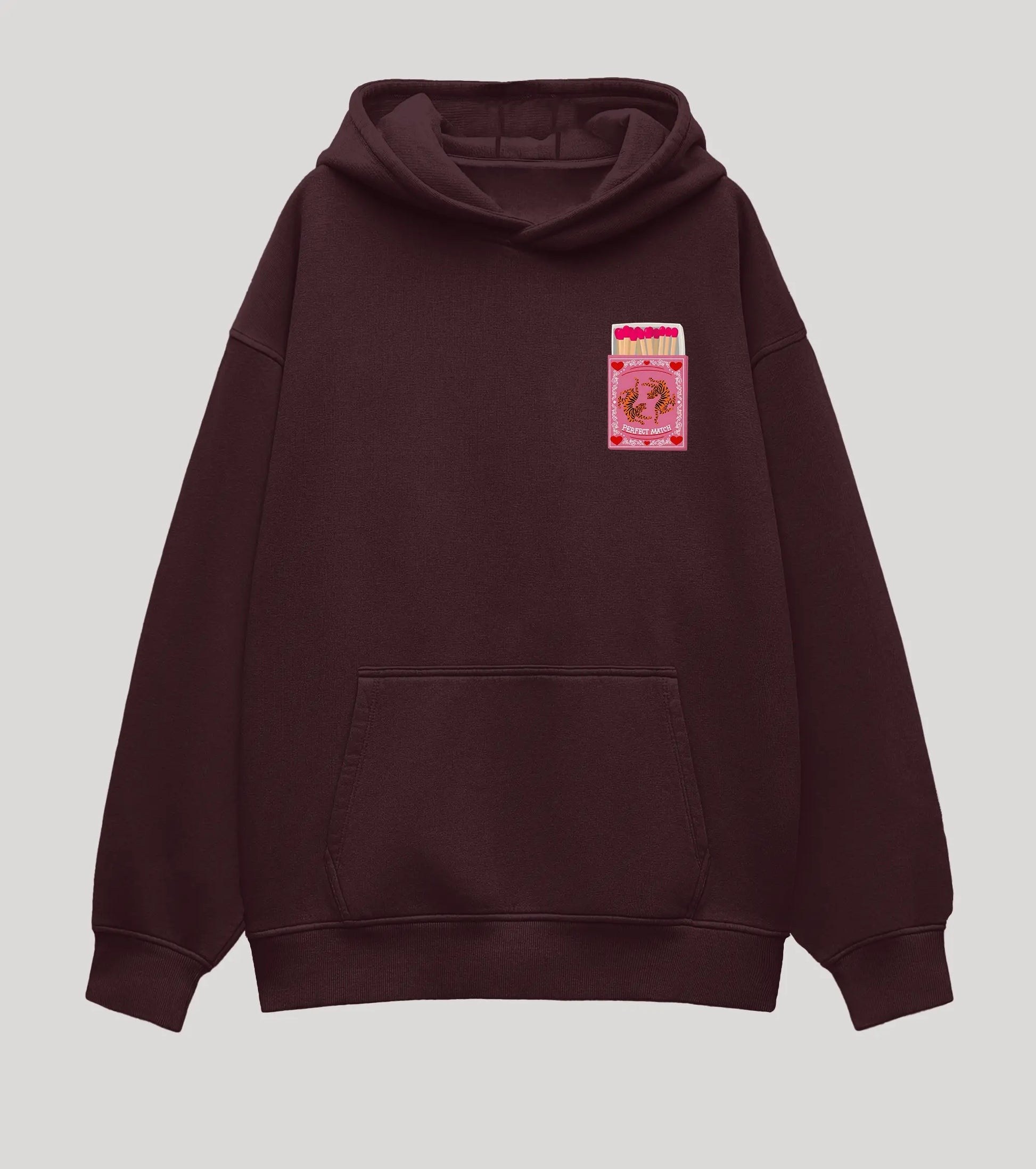 A maroon colored graphic hoodie in full sleeve with Perfect Match graphic printed at the front and at the back.